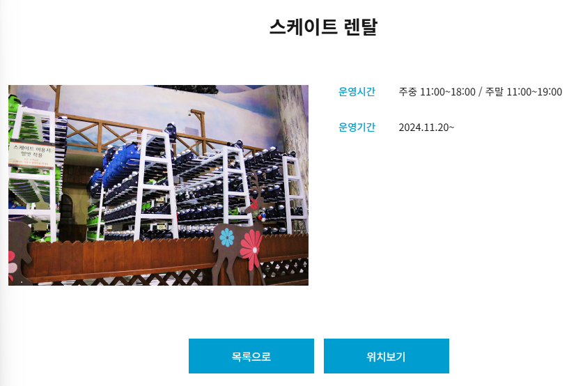 스노우파크 내부에는 다양한 시설이 마련되어 있습니다. 아이들이 즐길 수 있는 눈썰매장, 스케이트장, 그리고 눈놀이 공간이 있습니다. 특히, 스케이트장은 크리스마스 시즌에 맞춰 화려하게 장식되어 있어 방문객들에게 특별한 경험을 제공합니다.