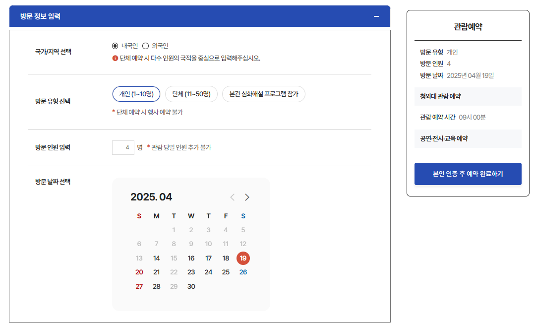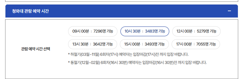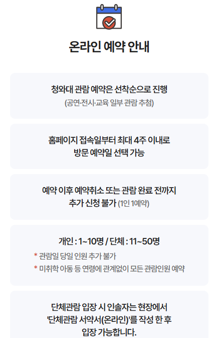 예약은 청와대 공식 홈페이지를 통해 진행할 수 있습니다.